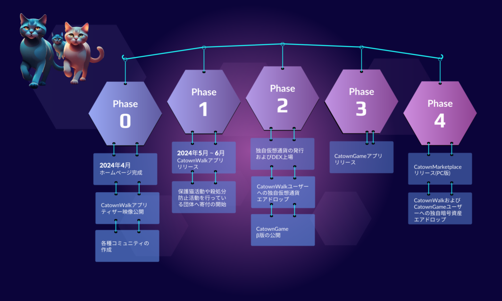 Catownへようこそブロックチェーン技術を用いて、猫と人間が幸せに暮らせるより良い社会の実現を目指します。 コミュニティに参加する Catownとは猫が集まる街をイメージしており、猫を愛する者の巨大コミュニティです。Catowner(コミュニティメンバー)はプロジェクトに参画することで報酬を得ることができます。各種サービスで得た利益の一部は保護猫活動や殺処分対策の資金となります。 サービス一覧 01Catown Work毎日の歩数が懸賞への抽選券となります。毎月初にYouTube Liveで抽選を実施します。 運動の習慣化 当選した懸賞品の使用用途自由 抽選券とは別のポイントを獲得し、今後実施される独自暗号資産のエアドロップ権利獲得 Catown Workサイトはこちら 02Catown Game対戦型のゲームで勝利することで独自暗号資産が獲得できます。 シンプルな心理戦ゲーム 毎週トーナメントを実施 Catown Workとの相互連携 03Catown Marketplace本来売れない電子書籍を売買できるようにし、2次流通時のロイヤリティーを作者へ還元するスキームを構築します。 電子書籍の売買自由化 独自暗号資産を用いた売買 電子書籍市場の活性化 ロードマップ 私たちのコミュニティに参加しませんか? 一緒に楽しい キャットライフを! support@catown.co